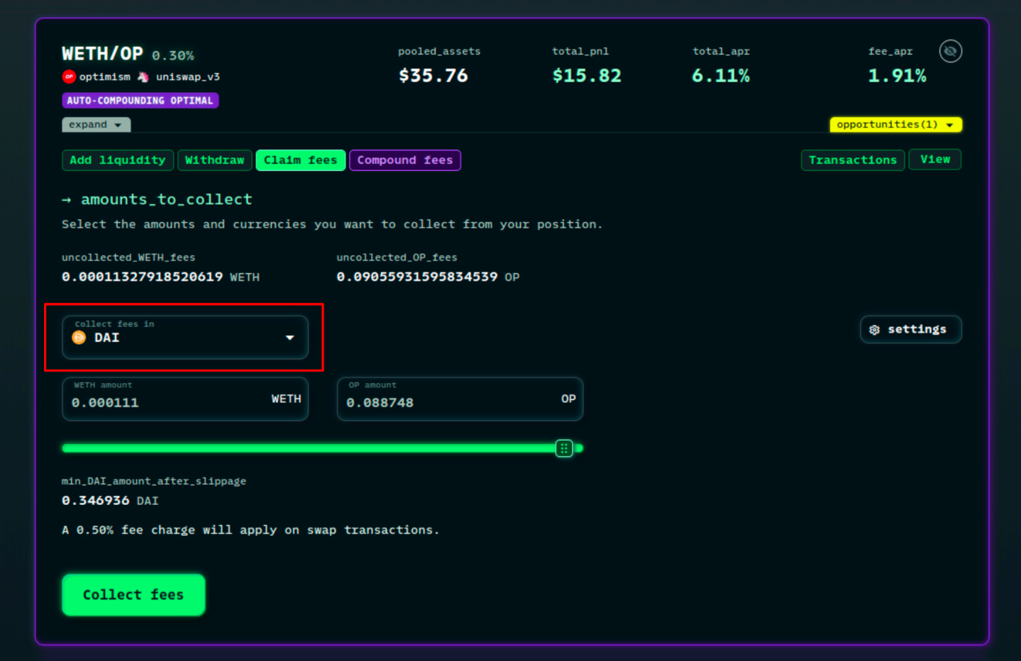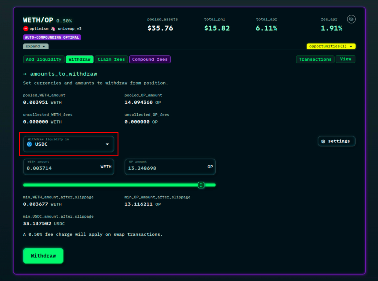 Collect fees from positions: You can likewise use the nifty slides to collect any amount of uncollected fees from a position you own. We can also save you the inconvenience of claiming and then swapping, only by selecting the new currency under the "Claim fees in" dropdown we will do it for you in only one transaction.