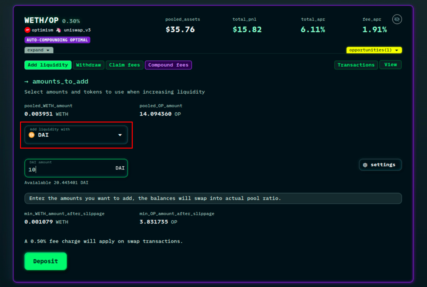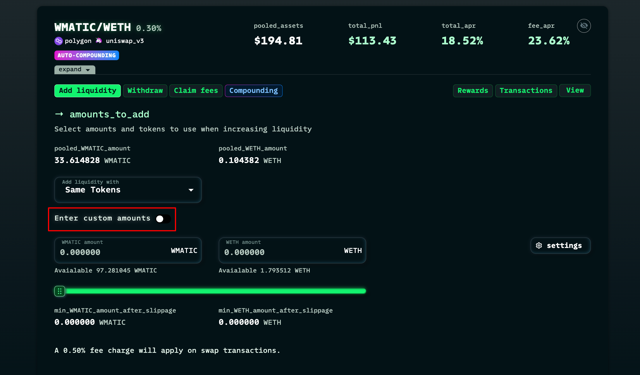 If you don’t have the right proportions, toggle on the “enter custom amounts” option and we will swap them into the actual pool ratio.