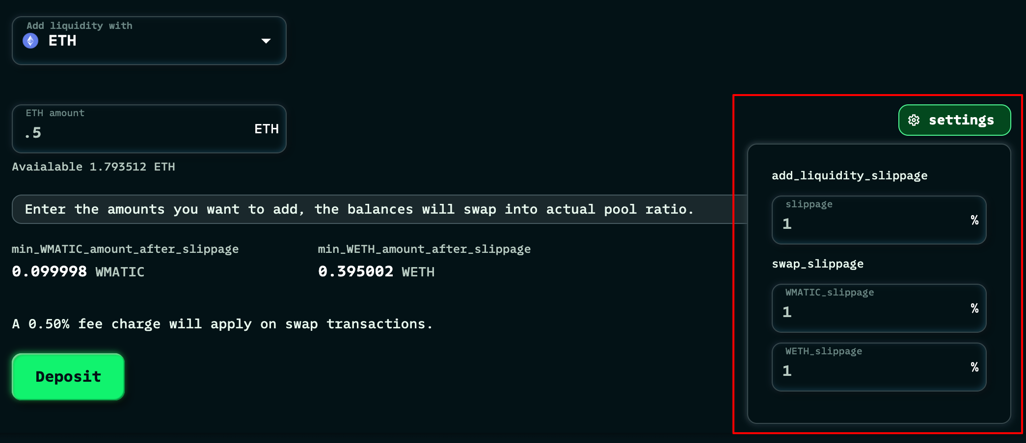 If you need the withdrawn tokens in a particular currency, we can swap them for you in the same transaction, just need to select the currency from the “withdraw liquidity in” dropdown. Check the slippage settings and change it if you want to.